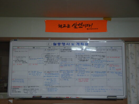 정특위 사무실 한 쪽 벽에는 ‘해고는 살인이다’라는 작은 플랜카드가 걸려있다. 그 아래의 일정표는 구속된 노조 간부들의 공판 날짜 등으로 빼곡하다.