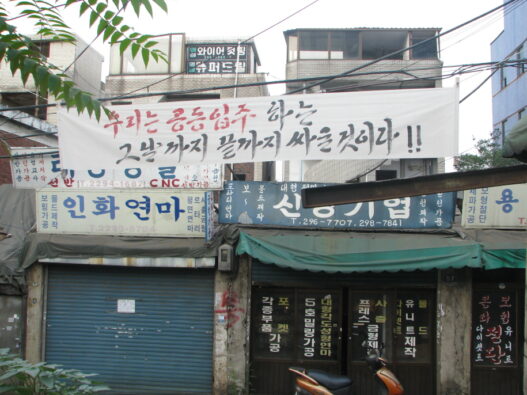 조선시대, 왕십리의 주변 지역에는 농기구를 팔아 생계를 유지하려는 대장장이들이 모여 살았다. 4대문과 가깝지만 내부에 속하지 않는 왕십리의 위치적 특성 때문이었다. 시간이 흘러 왕십리는 한 때, 서울 중심부 근처에서 철공소가 집중해 발달한 ‘쇠로는 뭐든지 다 할 수 있는’ 금속 공업의 메카로 불렸다. 그러나 금속사업자들을 전혀 고려하지 않은 왕십리 뉴타운 사업이 발표된 이후로 철공소들이 하나 둘 사라지기 시작했다.뉴타운 시범지구 지정 이후의 상왕십리동왕십리 뉴타운 3지구에 찾아가기 위해 상왕십리역에서 빠져나오자 대로변에 줄지어 늘어서 있는 낡은 철공소들이 눈에 들어왔다. 가게마다 오래된 간판 위에 재개발 반대를 위해 손으로 직접 쓴 듯한 조잡한 플래카드들이 하나씩 걸려 있었다. 한 눈에도 도시 정비가 필요해 보이는 낙후된 상왕십리동은 2002년 당선된 이명박 서울시장의 주도로 용산, 길음과 함께 강북의 균형 발전을 위한 뉴타운 1차 시범지구로 지정됐다. 시공사로는 대우건설과 용산 4구역의 시공사이기도 한 삼성건설이 참여해 대규모 재개발을 진행하기 시작했다. 그러나 환경이 개선될 새로운 왕십리는 몇 십년 간 어렵게 살아오던 원주민들이 누릴 수 있는 것이 아니었다. 왕십리 3지구 주변에 한 건물에도 두 세 개씩 자리 잡은 부동산은 왕십리 뉴타운 사업에 관심을 갖고 있는 것이 누구인지 짐작하게 했다. 용산과 마찬가지로, 적은 보상금으로 수십 년간 지내온 삶의 터전에서 쫓겨난다는 생각에 원주민들은 분노를 느낀 모양이었다. 플래카드는 고향같은 왕십리에서 떠나기를 종용하는 재개발 사업에 대해 저마다 다른 내용으로 강력하게 항의하고 있었다. 그러나 문을 열고 영업 중인 철공소는 몇 개 되지 않았다. 대부분이 간판과 플랜카드만 남겨둔 채로 굳게 문을 닫았다. 근처 부동산 중개업자는 “원주민은 80% 이상 떠났다. 남아있는 가게들도 올해 말까지는 정리할 것이고, 내년 초에는 착공이 전부 시작될 것”라며 동네가 한산한 이유를 설명했다. 중심지구의 주변에 모여서 발달하는 금속공업은 10개 이상의 업체가 협력해야 하는 사업의 특성상, 80%의 주민이 떠난 지금 남은 철공소도 앞으로의 운영은 힘들 터였다. 그래서 철공소 주인들 다수는 체념한 표정으로 “우리도 떠날 것”이라며 무심히 인터뷰를 거절했다. 30년 생활 터전을 두고 떠나는 한 원주민의 이야기