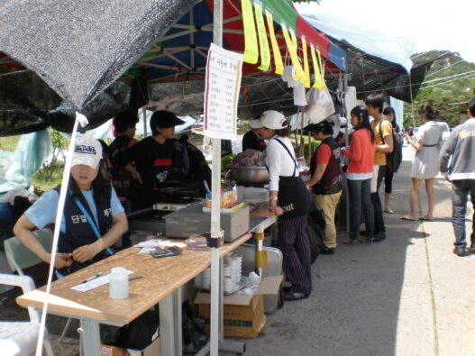 전국철거민연합회(전철연) 장터 모습. 축제 때마다 학관으로 올라오는 길목에서 장터를 하며 전철연에서 하는 일을 알리고 있다.
