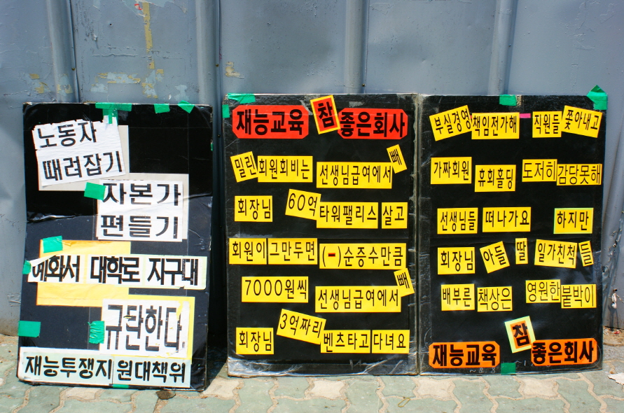 | 혜화동 재능 본사 앞에 놓인 피켓. 재능 본사 앞의 농성은 500일 넘게 이어지고 있다. |