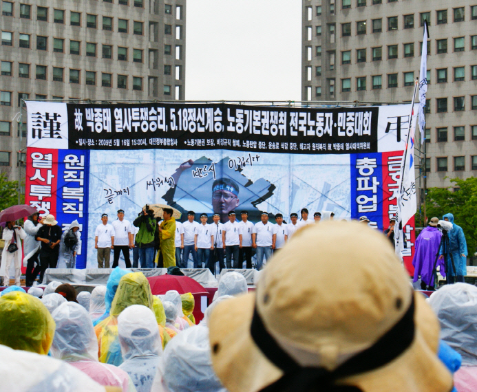 5월 16일, 화물연대는 조합원 총회를 열고 총파업을 결정했다.연단 위에 고 박종태 씨의 영정이 걸려 있다.지난 5월 16일에 대전시 대한통운 본사 앞에서 대규모 집회가 있었다.보수언론은 집회에 등장한 ‘죽창’만을 앞 다퉈 보도했다.고 박종태 씨가 ‘노동탄압 중단하라’며 목을 매단 것도, 대한통운이 일방적으로 계약해지를 통보한 것도 너무 쉽게 그 목소리를 잃었다.이에 사람들은 “박종태를 살려내라”며 만장을 꺾어 죽창을 만들었다.