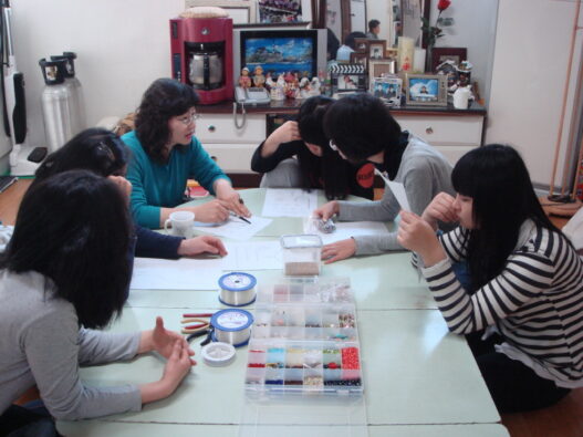 | 선생님에게서 비즈 공예에 대한 설명을 듣고 있는 고양쉼터 아이들. |