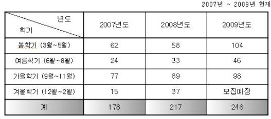 | 언어교육원 한국어교육센터 정규 프로그램의 외국학생들을 위한 한국어 도우미 지원 현황. 봄·가을학기에 비해 여름·겨울학기의 도우미 수가 현저히 적다. |