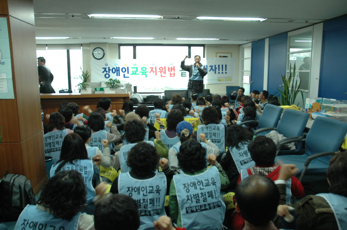 | 3.26 am 11:36국가인권위원회 인권상담센터를 가득 메운 100여명의 좌중은 ‘장애인 교육 차별 철폐하라’, ‘장애인교육지원법 제정하라’라는 구호를 외치며 피켓 시위를 벌였다. |