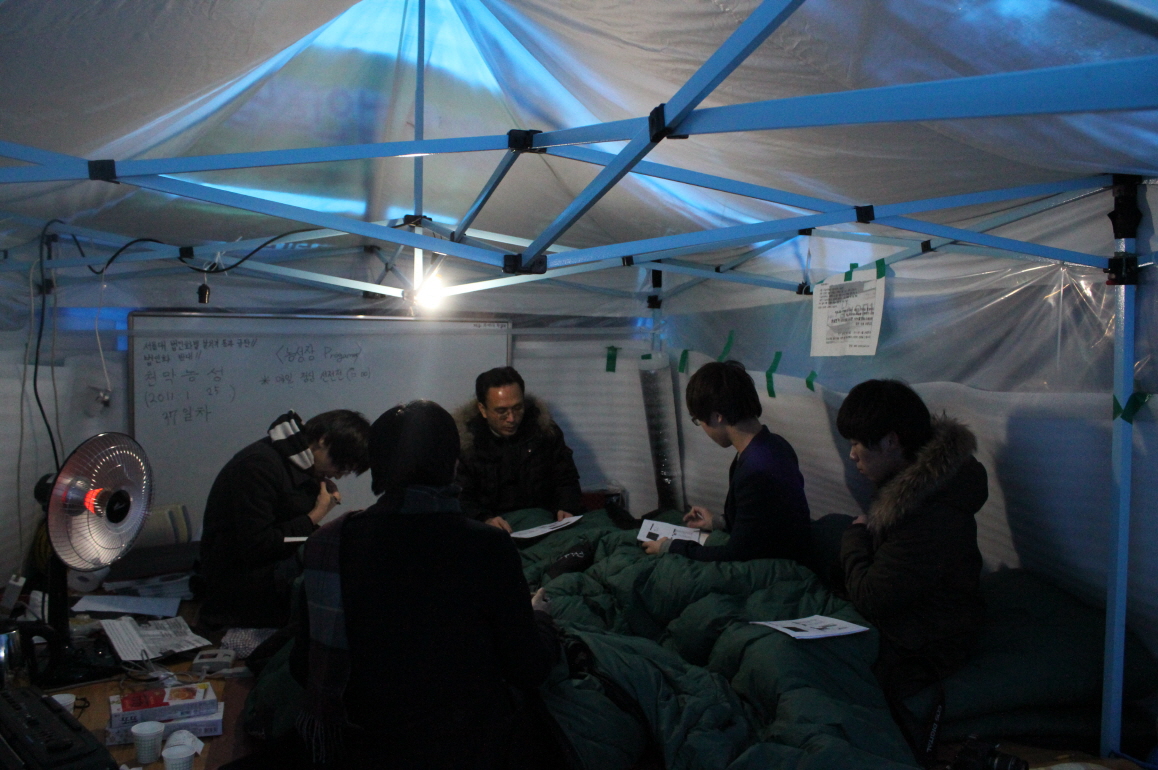 하얀 입김이 새어나왔다. 온기라고는 찾아볼 수가 없었다. 두꺼운 산악용 담요를 덮고 난로의 세기를 최고로 조절했지만 말할 때마다 새어나오는 입김은 좀처럼 멈추지 않았다. 2010년 12월 행정관 앞에 들어선 천막 안에는 그렇게 차가운 공기가 흘렀다. 파란 비닐, 플래카드가 조잡하게 장식된 천막은 매서운 한겨울 추위를 막기에 충분하지 않아 보였다. 처음 천막을 찾은 건 1월 25일, 세 번째 천막강연회가 열린 날이었다. 입구의 비닐을 젖히고 내부로 들어섰다. 천장이 낮아 머리를 부딪치지 않기 위해 허리를 구부정히 굽히고 들어갔다. 가장 먼저 시야에 들어오는 건 얼어서 터질듯 부푼 음료수 통들이었다. 비닐 벽에 기대있는 스티로폼들은 밖에서 스며드는 바람을 막기 위해 몸부림치고 있었다. 강연회에 참석한 사람은 기자 3명을 포함해 총 5명에 불과했다. 참가자들 사이에는 어색한 침묵이 흘렀다. ‘김제동의 토크콘서트’만큼은 아니지만, 많은 이들이 모여 열띤 토론과 배움의 장이 될 것이라는 기대가 무색해졌다. 천막 바깥에서 들려오는 지나가는 사람들의 말소리가 유달리 크게 들렸다.