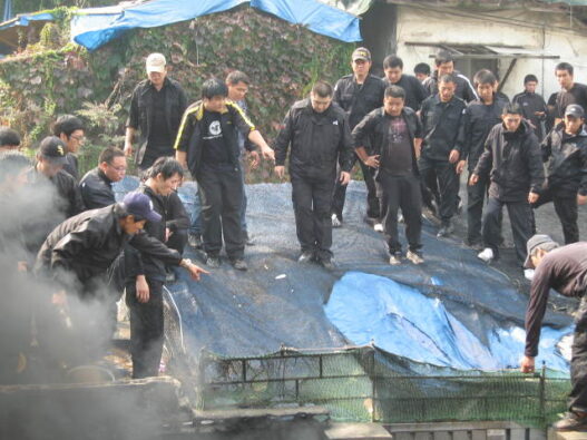 | 주민이 입구를 봉쇄하자 지붕으로 올라와 위협을 가하고 있는 검은 옷 차림의 용역직원들. ⓒ 빈민해방 철거민 연합 |