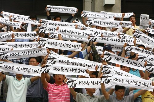 뜨거운 여름 태양만큼 언론노조의 여름도 뜨거웠다. 전국언론노동조합 본부( 본부 노조)는 29일간 제작현장을 떠나 파업을 진행했다. 잠잠해보이던 에서는 ‘PD 수첩’이 불방되며 다시 갈등이 표면화됐다. 예상대로 언론노조의 싸움은 현재 진행형이었다. 전국언론노동조합 본부 7월 1일 파업 돌입 본부 노조는 사측과의 단체협상이 결렬되자 7월 1일부로 파업에 들어갔다. 단체협상에서 공정방송위원회(공방위) 설치와 노조전임자 수 등 여러 사안에 대한 사측과의 의견이 좁혀지지 않았기 때문이다. 본부 노조는 2주간의 조정기간을 거치는 등 사측과의 합의를 위해 최선을 다했지만 사측의 무성의한 태도로 파업에 돌입할 수 밖에 없었다고 주장했다. 현재 노조는 ‘KBS 노조조합’과 ‘언론노동조합 KBS 본부’로 나눠진 상태이다. 이번 파업은 단체협상과 2주간의 조정기간, 노조원 총투표를 거친 합법적인 파업이었다. 하지만 사측은 새노조의 파업을 불법파업으로 규정했다. 본부 노조의 29일간의 긴 파업은 그렇게 시작됐다. 사실 파업은 이전부터 예고된 일이었다. 전국언론노동조합 본부 엄경철 위원장은 “지난 2년간 의 억압된 현실이 표출된 것”이라며 이번 파업이 필연적이었다고 강변했다. 그런 까닭에 광장에 모인 새노조원들은 모두 ‘를 살리겠습니다’ 라는 펼침막을 들고 있었다. 공영방송의 독립성이 붕괴되고, 저널리즘 정신이 무너지는 는 더 이상 국민의 방송이 아니라는 판단이 있었기 때문이었다.