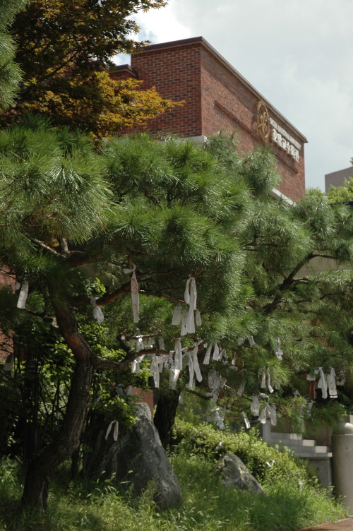| 회관 앞 나무에는 노조원들이 요구사항을 적어 매달아 놓은 리본들이 걸려있다. |