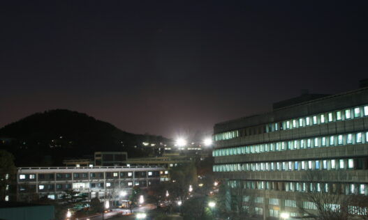 | 학생회관 옥상에서 바라본 인문대 쪽 전경. 밤 시간대임에도 불구하고 도서관과 연구실 곳곳에 불이 환하게 밝혀져 있다. |