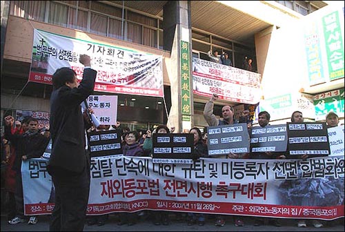 | 해마다 연말이면 이주노동자들에 대한 집중 단속과 강제 추방이 이뤄진다. 사진은 2007년 11월 이주노동자 집중 단속에 항의하는 집회. ⓒ오마이뉴스 |