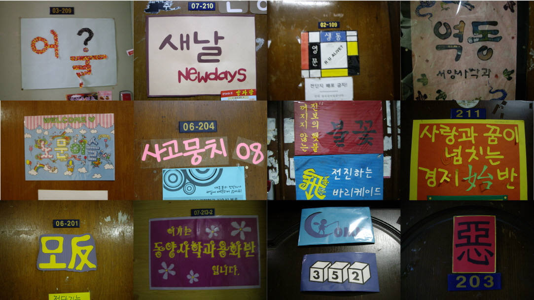 인문대, 사회대 과방문들. 각 과방마다 학생들이 직접 만든 개성 가득한 문패들이 달려 있다.