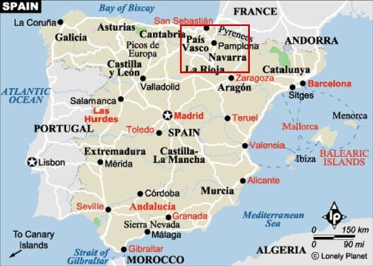 스페인 지도. 붉은 테두리로 표시된 지역이 바스크족의 근거지다.