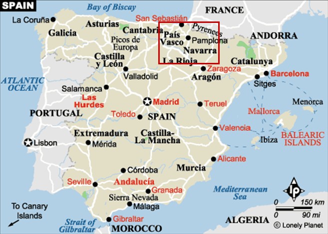 스페인 지도.붉은 테두리로 표시된 지역이 바스크족의 근거지다.필자는 이번 학기에 스페인 북부 팜플로나에서 수학하고 있다.피레네 산맥을 경계로 프랑스와 국경을 마주하고 있는 이곳은, 스페인의 19개 자치주 중 하나인 나바라의 중심 도시로서 소몰이로 유명한 산 페르민(San Fermin) 축제 기간을 제외하고는 상대적으로 관광객의 발길이 적은 조용한 지역이다.