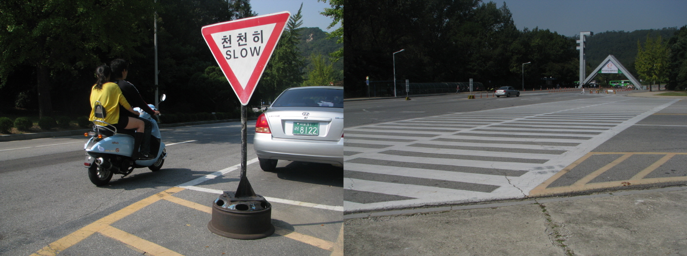 | 본부 진입로에서 헬멧을 쓰지 않은 두 학생이 스쿠터에 합승을 하고 있다. 교내에서는 이들을 단속할 수 있는 법령이 없다.(사진 왼쪽) 정문 앞 횡단보도는 도로교통법 상 횡단보도와 구별된다.(사진 오른쪽) |