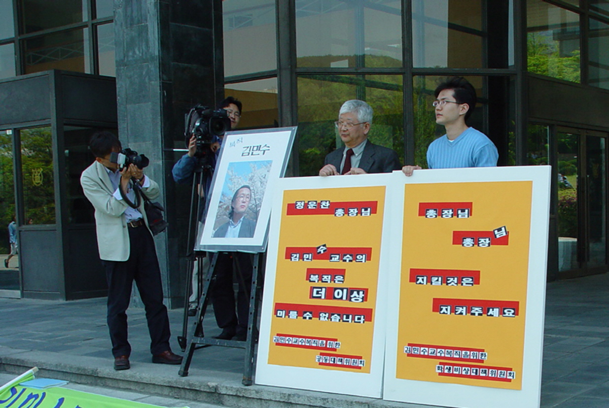 | 2005년 3월 통권 제71호, [커버스토리] 승소부터 복직 논란까지, 그 복잡한 속사정, 김혜숙·신혜정 기자. 1998년 김민수 교수(디자인학부)가 서울대 미대 원로교수들의 친일행적을 거론한 논문때문에 재임용 심사에서 탈락했다. 사건 이후 꾸려진 ‘김민수 교수 복직을 위한 공동대책위원회’에서 활동한 김수행 교수가, 본부 앞에서 박경렬 제46대 총학생회장과 함께 ‘김민수 교수 복직촉구 대회 및 교수·학생 2인 연속시위’의 출발선을 끊었다. 6년 여만의 싸움 끝에 김민수 교수는 2005년 부교수로 복직했다. |