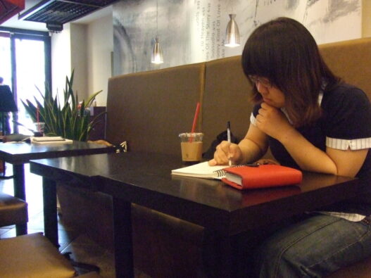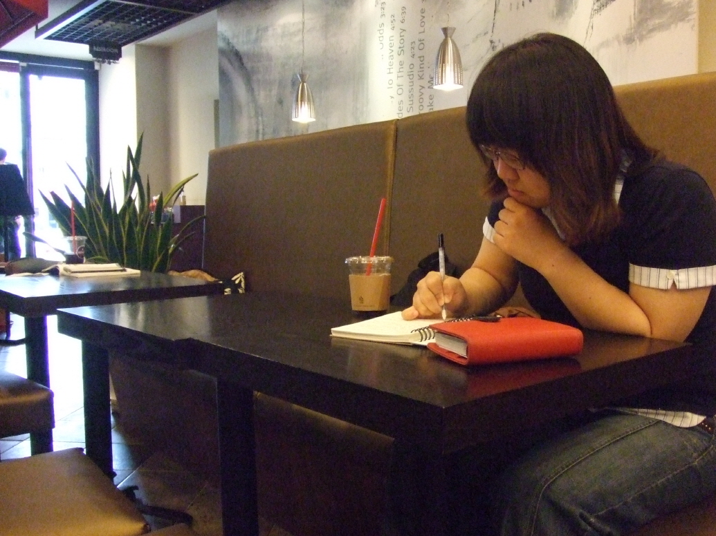 | 커피숍에 앉아 진지하게 마지막 글을 남기고 있는 모습. |