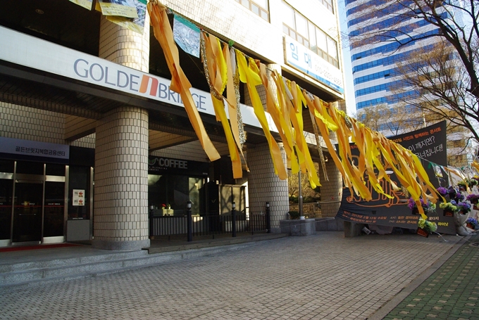 골든브릿지 본사 앞. 노조에서 걸어놓은 노란 띠가 바람에 휘날리며 자리를 지키고 있다