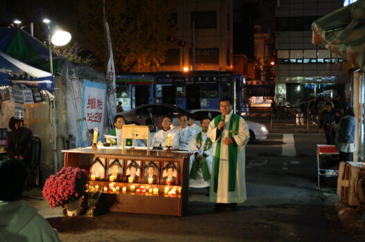 매일 저녁 7시, 용산 남일당 현장에는 2009년 1월 20일 망루위에서 목숨을 잃은 5명의 철거민의 넋을 기리는 생명평화미사가 열린다. 생명평화미사는 3월 28일 문정현 은퇴신부가 시작한 이후로 현재까지 진행되고 있다. 남일당에 늘 머물며 유가족을 돌보고, 위로하는 천주교 빈민사목위원회 위원장인 이강서 신부와 정의구현사제단 전종훈대표신부를 만났다. 어떤 계기로 용산참사에 관심갖게 됐나?원래 천주교 빈민사목위원회에서 활동을 했다. 수도권 빈민 문제는 역사적으로 재개발, 철거문제와 밀접하게 연관돼 있었다. 같은 가난한 사람을 대상으로 하는 활동 중 한 곳이 용산이다. 참사 발생 후 적극적으로 개입하게 됐는데, 초기에는 긍정적인 기대를 했지만 시간이 흘러 사태가 악화되었다. 해결의 기미가 보이지 않았다. 그 후 부활대축일에 위로를 위해 현장 방문을 구상했고, 문정현 신부가 3월 28일부터 생명평화미사를 드리게 됐다.