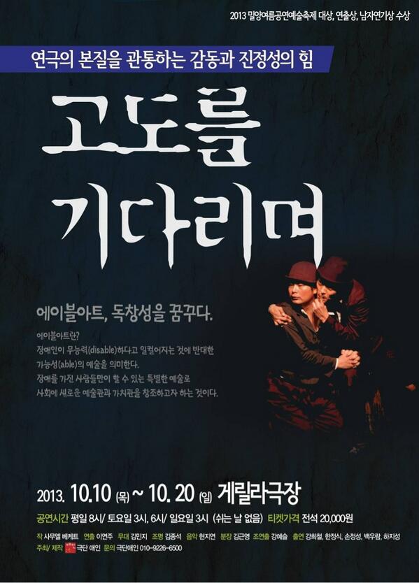 애인이 극단의 이름을 알린 본격적인 계기는 <고도를 기다리며>(사무엘 베케트 작, 이연주 각색/연출)라는 작품이었다. 애인은 2010년도부터 무려 4년 동안이나 수정을 거듭하여 여러 번 이 공연을 올렸다. 2013년도에는 밀양여름공연예술축제에서 대상을 포함한 3관왕에 오르기도 하며 한국 장애 연극의 새로운 가능성을 보여주었다. 그러나 이렇게 긴 작업 기간은 장애인 극단이 자신들의 ‘차이’를 장점으로 살린 연극을 만드는 일이 얼마나 어려운지를 단적으로 보여주는 예이기도 하다.
