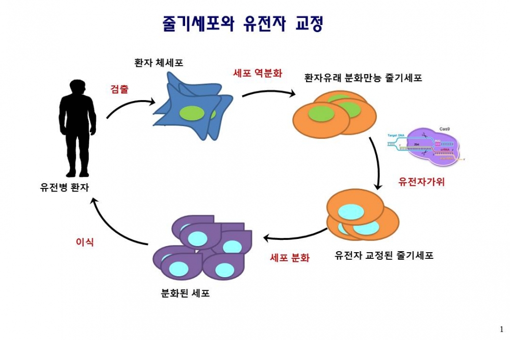 유전자가위 기술은 분화만능 줄기세포에 도입되어 수많은 유전병 치료에 기여할 수 있다. 유전병의 원인이 되는 유전자는 1만 개에 달하고 신생아의 1%는 유전질환을 가지고 태어난다. 유전병 환자의 체세포로부터 분화만능 줄기세포를 손쉽게 만들 수 있으나 이 세포는 유전병의 원인이 되는 돌연변이를 그대로 가지고 있다. 이를 유전자가위를 이용해 교정하면 면역거부반응을 일으키지 않는 환자 맞춤형 세포치료제로 사용될 수 있다.
