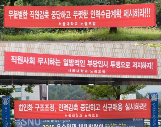 ▲ 서울대 노조가 캠퍼스 내에 설치한 현수막.  ⓒ김대현 사진기자