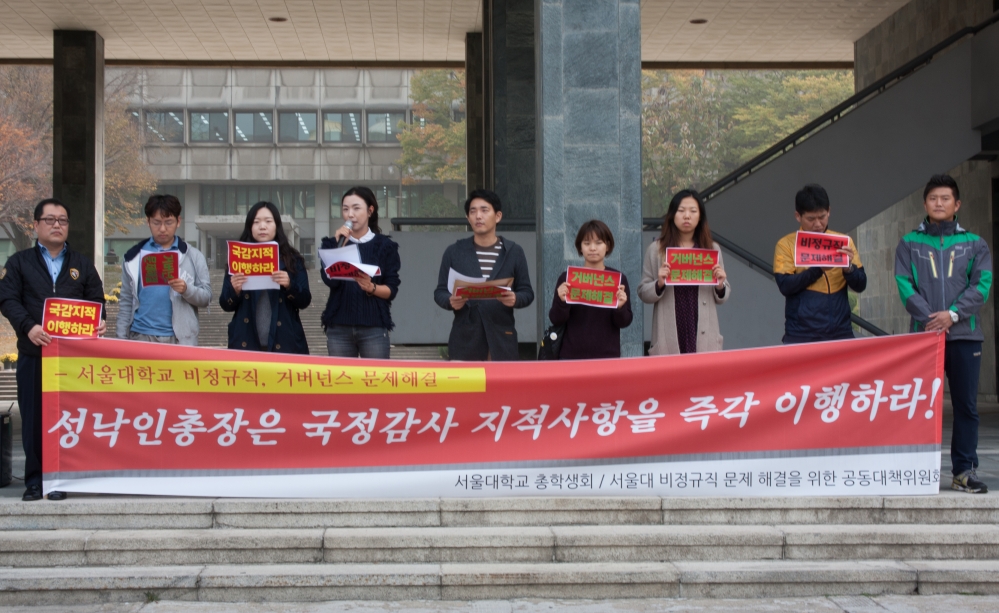 오늘 오전 행정관 앞에서 총학생회와 서울대 비정규직 문제해결을 위한 공동대책위원회(공대위)가 학내 비정규직 문제, 거버넌스 문제에 대한 국정감사 지적사항 이행을 촉구하는 기자회견을 열었다.