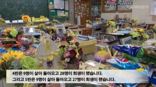 4반은 9명이 살아 돌아오고 28명이 희생이 됐습니다. 그리고 5반은 9명이 살아 돌아오고 27명이 희생이 됐습니다. 5반 교실에서는 조금 다른 얘기를 저도 잘 모르는 얘기를 하겠습니다. 그 8월 30일 날 이 기억과 약속의 길을 하면서 어떤 중학교 2학년 아이를 만났습니다. 근데 그 아이는 4반의 2명의 오빠를 만나러 왔던 것이고요. 그 2명의 오빠는 음악동아리를 같이 했던 오빠입니다. 기억과 약속의 길을 다 끝나고 그 친구가 저를 계속 보고 있기에 불러서 좀 얘기를 좀 했습니다. 그래서 이것저것 물어봤는데 지금까지 자살시도를 세 번 했다고 합니다. 제가 놀래가지고 이렇게 보고 있으니까 걱정 마세요 오늘 오빠들하고 약속했어요 다시는 그렇지 않겠다고 용감하게 살아서 오빠들의 뜻을 오빠들의 억울한 죽음을 동생으로서 이런 얘기를 하더라고요. 그리고 8월 31일 날 일산에 있는 여기 3반의 시헌이 친구가 자살을 했습니다. 저는 9월 2일 날 그 사실을 알게 됐고요. 그래서 되게 놀랬습니다. 놀래가지고 제 주변에 있는 교육현장에 있는 지인들한테 물어봤습니다. 알 수 없다고 하더라고요. 알 수 없다. 이게 꼭 안산의 문제만은 아니겠구나 하고 그때 이제 심각하게 받아들였는데 250명의 친구들은 어떤 상태일까 그 친구들은 어떤 분노, 어떤 생각을 하고 살아갈까 그래서 이제 기억저장소는 고등학생들, 대학생들 친구들이 비교적 자발적으로 오는 공간이여서 가끔 그런 것들을 넌지시 물어보는데 굉장히 답답해하는 것은 확실한 것 같습니다. 그 아이들의 분노가 어떻게 그 이후에 어떤 형태로 나타날지 8월 30일과 31일의 일을 놓고 봤을 때 사실은 좀 많이 두렵습니다. 우리 사회가 그것에 대한 대처능력은 물론 없겠죠? 있을 수 있을까요?