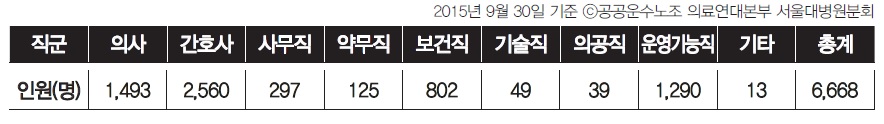 서울대학교병원(서울대병원)과 그 분원(보라매병원, 서울대병원 강남센터, 세종시립의원)에서 근무하는 정규직 근로자의 수는 약 6,600명이다. 이들의 자세한 인원 구성은 표와 같다.