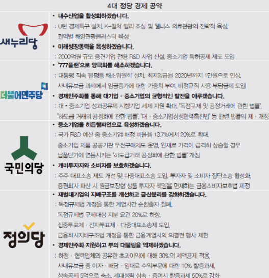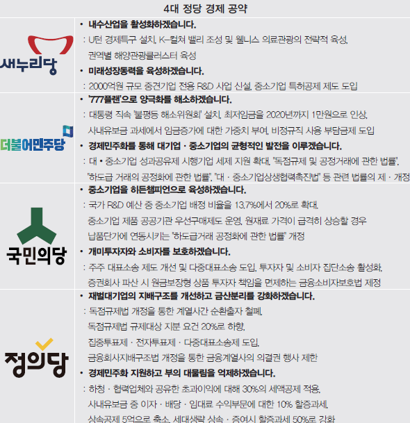 대•중소기업간 공정경쟁질서를 구축함에 있어서는 국민의당은 ▲국가 R&D 예산 중소기업 배정 비율 13.7%에서 20%로 확대 ▲매출 1,000억 원 벤처기업 1000개 육성 등 ‘벤처 중소기업 육성안’을 중점적으로 제시했다. 정의당은 ▲독점규제법 개정을 통한 계열사간 순환출자 철폐 ▲집중투표제•전자투표제•다중대표소송제 도입 ▲금융회사지배구조법 개정을 통한 금융계열사의 의결권 행사 제한 등 ‘재벌대기업 지배구조 개선’에 집중했다. 더민주는 대•중소기업 간 시장지배력 조정을 위해 개정이 필요한 법률들을 명시했으나, 그 구체적인 방안은 언급하지 않았다.