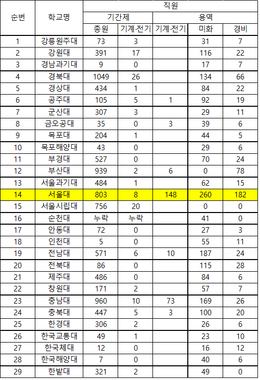 전국 29개 국공립 대학 중 대다수 기계·전기 노동자를 용역 형태로 고용한 대학은 서울대와 충남대뿐인 것으로 드러났다. 민주노동조합총연맹(민주노총) 일반노동조합(일반노조) 서울대 기계·전기 분회가 공개한 ‘공공부문 비정규직 고용개선 시스템(2015.12.31. 기준)’에 따르면 서울대는 가장 많은 기계·전기 노동자를 용역업체를 통해 고용하고 있었다.