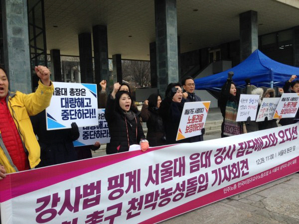 서울대학교 음악대학 성악과 측이 1월 시행 예정이었던 ‘고등교육법 개정안(시간강사법)’에 따라 기존 강사들을 해고하고 신규 강사를 채용하기로 결정했다. 그동안 성악과 측은 학과 특성을 고려해 시간강사에게 5년의 임기를 보장해왔다. 그런데 이번 채용 공고를 통해 1년에 한 번 오디션을 진행할 것을 공식화한 것이다. 지난 12월 강사의 대량 해고를 우려해 시간강사법 유예 법안이 국회에서 통과됐는데도 학교 측은 강사 채용을 강행했다. 이에 인원 감축을 우려한 시간강사들은 지난 12월 학교 본부 앞에서 천막 농성에 돌입했다. 순식간에 벌어진 성악과 강사 대량 해고 사태를 시간 순으로 정리해봤다.