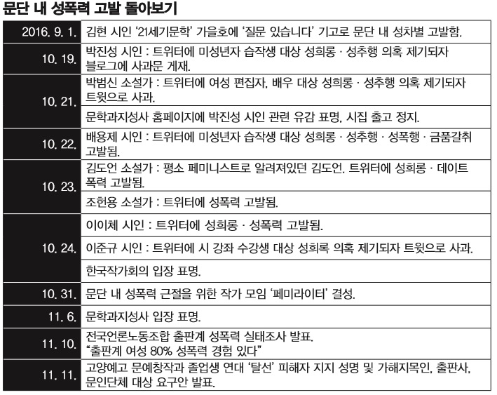 문단의 경우 박진성 시인과 박범신 소설가에 대한 의혹이 SNS상에서 가장 먼저 제기됐다. 지난 10월 19일 한 트위터 이용자가 미성년자 습작생 시절 박진성이 자신에게 성희롱 발언을 하고 강압적으로 신체접촉을 했다고 밝혔다. 박범신은 출판계 여성 편집자와 여성 방송작가, 여성 배우에 이르기까지 다양한 분야의 여성 종사자에게 성희롱을 일삼았다는 의혹을 받았다. 곧이어 배용제, 김도언, 이준규, 이이체, 황병승 등 다른 시인들에 의한 성폭력 피해 고발이 터져나왔다. 특히 배용제에게 문학 강습을 받았던 습작생 6인은 트위터 계정 ‘고발자5’를 만들어 배용제가 문단 내 위계와 교권을 내세우며 성희롱·성추행·강제성관계를 저질렀다고 폭로했다. 또 다른 트위터 계정 ‘화난여자들’은 “김도언에게 성적 농락과 추행, 언어폭력, 데이트폭력, 스토킹을 당한 피해 여성들의 모임”임을 밝히며 현재까지도(2016년 11월 29일 기준) 김 씨에게 사과를 요구하고 있다.