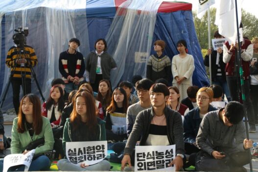 오늘(19일) 총장 퇴진과 실시협약 철회를 촉구하는 집회가 행정관(60동)에서 열렸다. 학생들은 행정관 4층 총장실 앞에서 농성 중인 임수빈(조소 11) 부총학생회장에게 효소를 전달하고, 함께 릴레이 단식 중인 강유진(경제 13) 사회대 학생회장, 도정근(물리천문 15) 자연대 학생회장이 다른 대표자와 교대할 수 있도록 출입을 요구했으나 본부는 이를 거절했다.