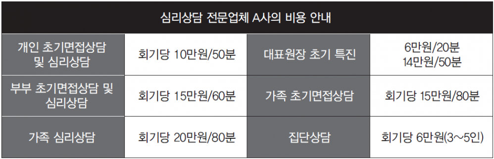 일반적으로 가장 떠올리기 쉬운 심리상담 서비스는 사설 상담서비스다. 그중에서 규모가 큰 상담서비스는 기업형 상담센터에서 찾아볼 수 있다. 그런데 보건복지부, 한국상담심리학회 등 공신력 있는 기관의 1급 자격증을 취득한 전문가나 경영자가 운영하는 기업형 상담센터는 대체로 50분 회기당 10만 원에 달하는 상담비를 요구한다. 상담자의 숙련도와 유명세에 따라 상담비가 시간당 20만원을 넘는 경우도 있다. 보통 상담이 10-20회기에 걸쳐 진행된다는 것을 감안했을 때 부담이 되는 가격이다. 그러나 상담자가 전문성을 얻기까지 적지 않은 비용이 드는 것도 사실이다. 보건복지부 공인 1급 정신보건임상심리사 조영은 박사는 “장기간의 무급수련과 월급 200만 원이 안 되는 고된 박봉 생활, 수년간 위와 비슷한 상담비를 지불하며 교육 분석을 받았다는 점이 (상담비 책정에) 반영됐을 것이다”라고 설명했다.