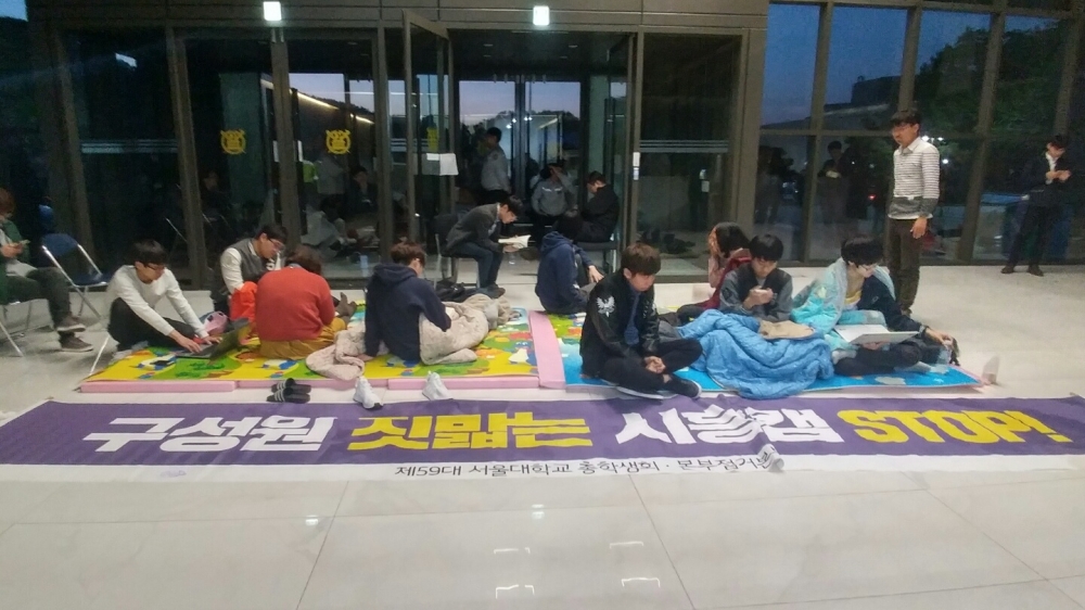 오늘(27일) 오후 6시부터 ‘성낙인 총장 퇴진! 시흥캠퍼스 실시협약 철회! 학생행동(학생행동)’과 ‘성낙인 총장 퇴진과 시흥캠퍼스 실시협약 철회를 위한 특별대책위원회(특대위)’ 소속 학생 20여 명이 총장과의 면담을 요구하며 행정관 로비에서 연좌농성에 돌입했다. 다른 학생들은 행정관 앞에서 성낙인 총장 퇴진과 실시협약 철회를 요구하는 집회를 진행하고 있으며, 본부는 퇴근한 직원들을 모아 행정관 출입을 막고 있다.