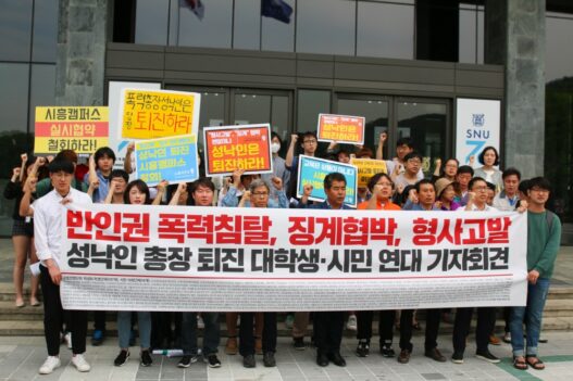 오늘(4일) 오후 1시 행정관(60동) 앞에서 ‘반인권 폭력침탈, 징계협박, 형사고발 성낙인 총장 퇴진 학생-시민단체 기자회견’이 열렸다. 이날 기자회견에는 전국대학노동조합, 민주화를 위한 전국교수협의회 등 164개 학생·시민단체가 연명했다. 또한 ‘민주사회를 위한 변호사 모임’의 권영국 변호사, 장지웅 정의당 청년미래부 부본부장, 김병국 전국대학노동조합 정책실장 등이 참여해 발언했다.