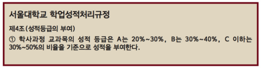 서울대학교 학업성적 처리 규정 제4조에는 ‘학사과정 교과목의 성적 등급은 A는 20%~30%, B는 30%~40%, C 이하는 30%~50%의 비율을 기준으로 성적을 부여한다’고 명시돼 있으며, 이외에 성적 평가 방식과 관련된 세부 조항은 없다. 학사과 김정빈 주무관은 ‘학사과정 교과목’은 교양 및 전공 과목을 일컬으며, 현재 해당 조항은 권고가 아닌 필수 사항이라고 말했다. 그는 전산 시스템상에서 성적 입력 시 담당 수업의 성적 부여 비율이 초과될 경우 입력 자체가 불가능하도록 설정됐다고 덧붙였다. 이 시스템은 2004년 2학기에 교양 과목에 한해 처음 도입됐다. (“고급영어, 고급수학 등 제외 교양강의 상대평가 전면 실시”, 2004. 7. 24., <대학신문>)