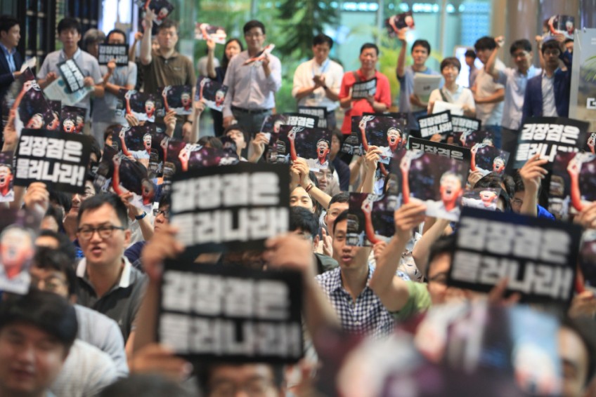 7월 17일 김장겸 고영주 퇴진 MBC비상행동 출범식에서 MBC 구성원들이 구호를 외치고 있다.