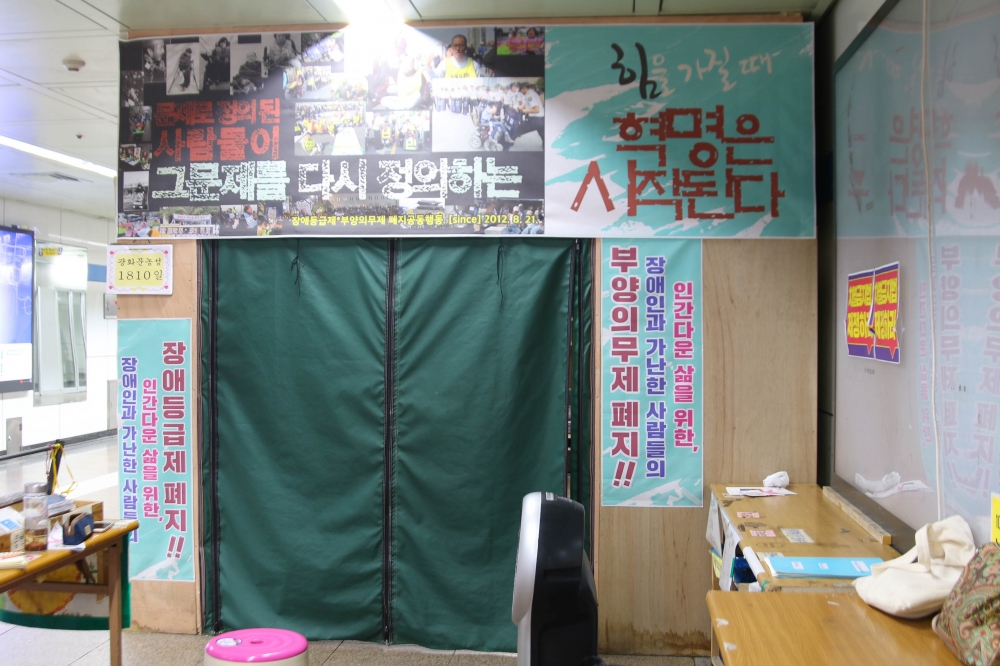 지하철 5호선 광화문역, 해치마당으로 이어지는 9번 출입구 아래편 길목에는 5년째 같은 자리를 지키고 있는 사람들이 있다. ‘장애등급제·부양의무제 폐지 공동행동 광화문 농성장(농성장)’의 활동가들이다. 농성장은 2012년 18대 대통령 선거 국면 이전 장애등급제·부양의무제·장애인수용시설 폐지 공약을 요구하며 광화문역 지하보도에 어렵게 자리를 틔웠다. 정부청사와 청와대가 가까이 있어 광화문이 상징적인 거점이 될 수 있으리란 기대에서였다. 물론 당시에는 농성이 5년이나 이어질 것이라고 누구도 예상하지 못했다.