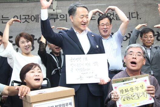 8월 25일 광화문 장애인농성장을 찾은 박능후 보건복지부장관 ⓒ천지일보