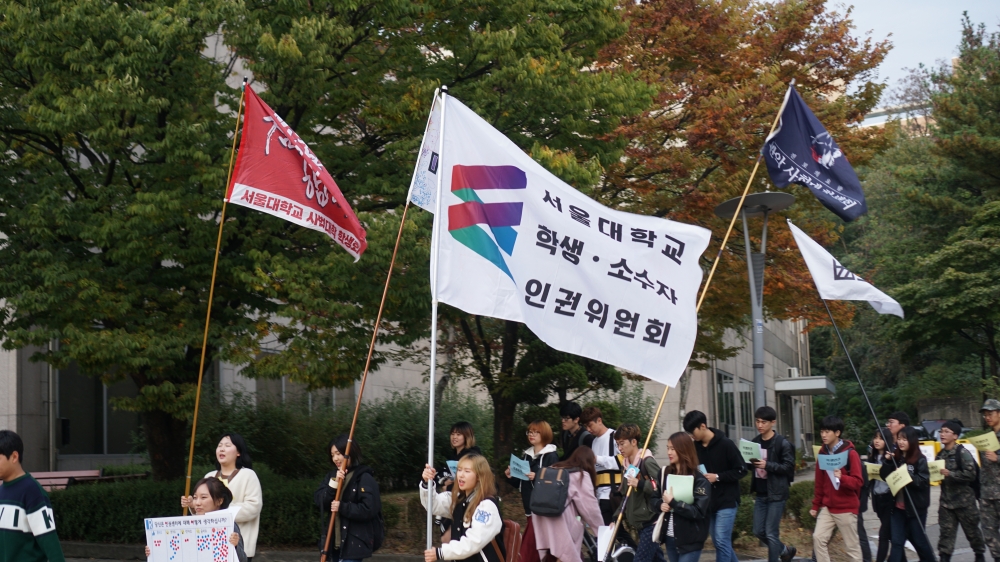 오늘(12일) 오후 5시 ‘학생‧소수자인권위원회(학소위)’를 비롯한 ‘서울대학교 학생인권을 위한 연대체(연대체)’가 ‘학생인권을 위한 행진’ 행사를 열었다. 참가자들은 중앙도서관 앞 아크로폴리스에서 인권센터(153동)까지 행진하며 인권센터와 본부가 학생인권을 충분히 보장해야 한다고 촉구했다.
