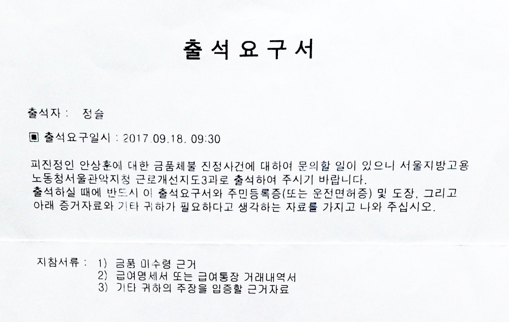 정슬 씨는 지난 8월 고용노동부 관악지청에 글로벌사회공헌단 단장을 근로기준법 위반으로 제소했다.