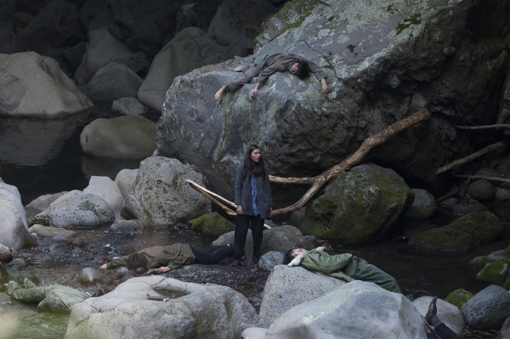 ‘우리를 갈라 놓는 것들’의 한 장면으로, 김동일 할머니를 재현한 여성이 도처에 널린 희생자들을 바라보고 있다. ⓒ국립현대미술관