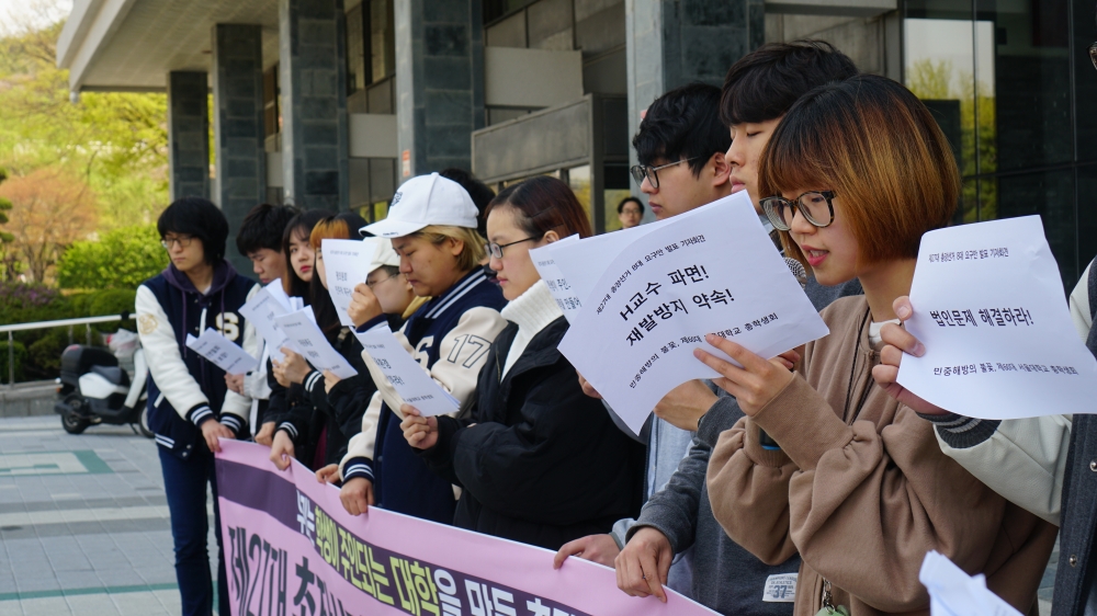 ‘사회학과 H교수 사건 대응을 위한 학생연대’ 백인범(사회 16) 대표는 교수에 의한 인권침해 사건에 대한 대학본부의 대응이 미흡하다고 비판하며, “새로운 총장 후보는 지금까지 서울대가 보여 왔던 미진한 대응에 대해 반성적 평가를 내리고, 학생과 협의해서 (교수에 의한) 성폭력과 갑질에 대한 대책을 마련할 수 있어야 한다”고 말했다. 백 대표는 차기 총장에 ▲H교수에 대한 파면 처분 ▲인권센터와 교원징계위원회에 학생 참여 보장 ▲교수에 의한 인권침해 사건 대응을 위해 학생이 참여하는 민주적 협의 기구 설치를 요구했다.