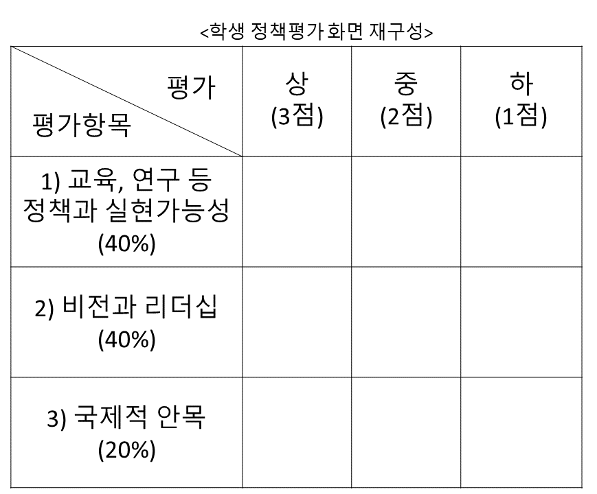 이번 정책평가는 교육, 연구 등 정책과 실현가능성 비전과 리더십 국제적 안목 3개의 항목에 상·중·하로 점수를 매기는 방식이었다. 교수와 직원은 5월 10일 문화관 중강당에 모여, 학생은 사전에 정책평가단에 등록한 사람에 한해 전송받은 링크를 통해 정책평가에 참여했다. 그러나 이번 정책평가는 지금까지 지적돼온 구성원 참여 인원 및 반영비율 문제가 충분히 개선되지 않았다는 점에서 아쉬움을 남겼다.