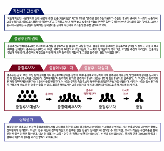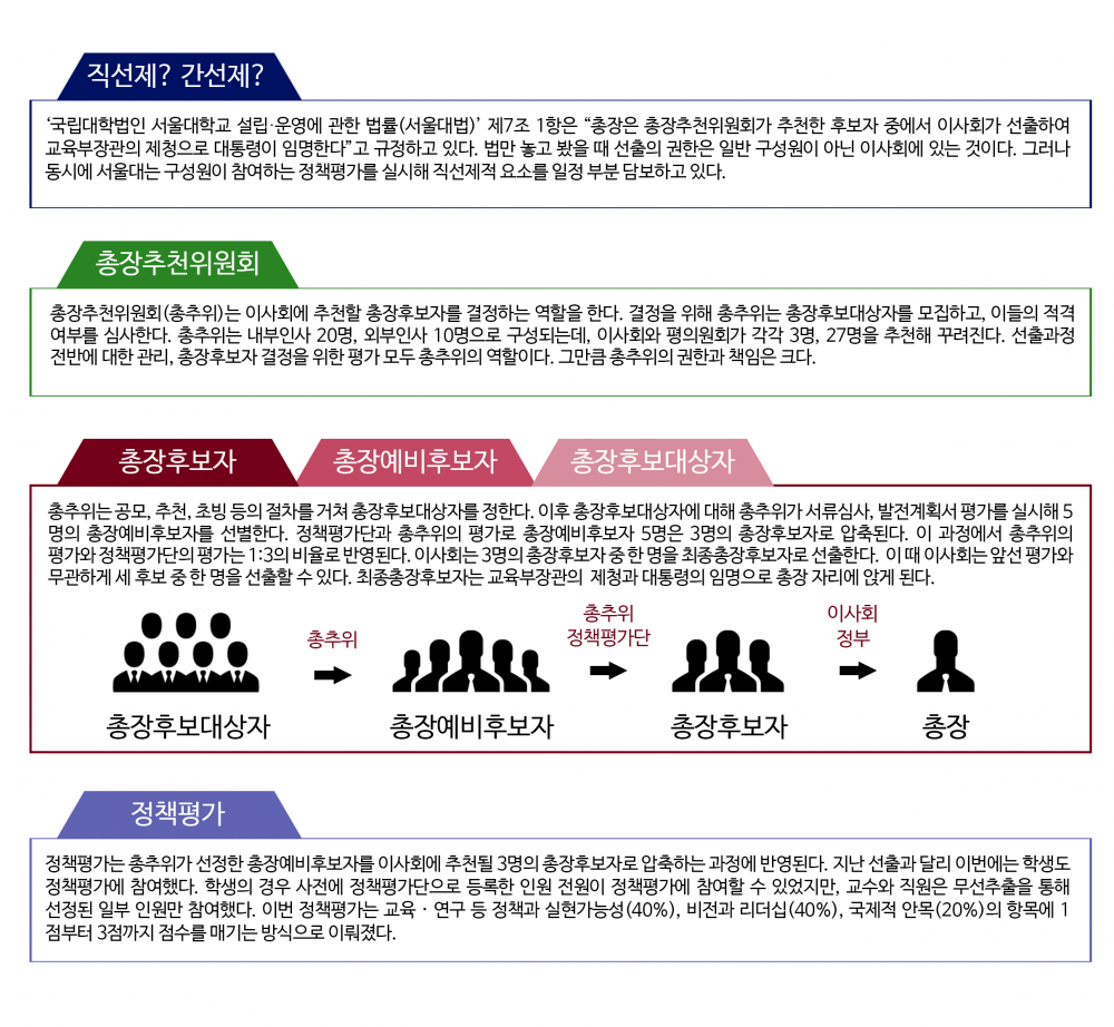 총장추천위원회, 정책평가, 총장예비후보자, 이사회, 9.5%, 학생총투표……. 총장선출과정에서 접한 어렵고 낯선 말들이다. 학생총투표가 성사됐다면서 왜 우리는 한 사람을 뽑는 투표가 아니라 점수를 매기는 정책평가라는 방식으로 참여하게 됐을까? 마이스누(mySNU) 탭에 표시된 총장추천위원회는 어떤 일을 하는 곳일까? 내겐 너무 어려운 총장선거, 어떤 방식으로 어떻게 진행됐는지 살펴보자.