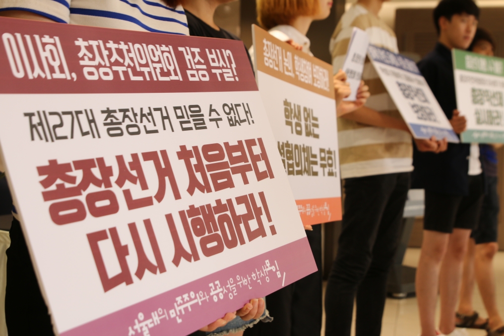 지난 5월 10일 이뤄진 정책평가와 6월 18일 이사회 회의를 거쳐 강대희 교수가 제27대 총장 최종후보자로 선출됐다. 그러나 7월 3일 <한겨레>를 통해 강 교수의 성희롱 전력이 폭로됐고, 이어 강 교수가 여교수를 성추행한 적이 있다는 제보를 여교수회가 총추위에 전달했다는 것이 보도됐다. 논란이 불거지자 강 교수는 6일 후보직을 내려놨다. 강 교수의 사퇴 이후 총장선출과정에서 예비후보자 및 후보자 검증을 담당한 총장추천위원회(총추위)와 이사회의 책임론이 학내외에서 대두되고 있다.