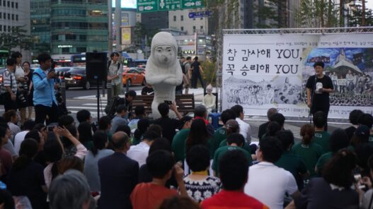 ‘반도체 노동자의 건강과 인권 지킴이’(반올림)의 천막 농성이 1023일 만에 마무리됐다. 반올림은 어제(25일) 저녁 7시 서초구 삼성 전자 사옥 앞에서 ‘참 감사해 유(YOU), 꼭 승리해 유(YOU)’ 문화제를 열어 농성 해단을 기념했다.