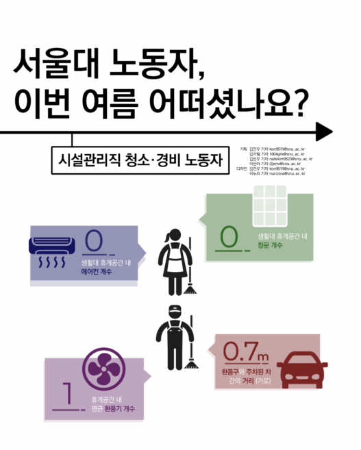 기상 관측 이래 최악이라는 이번 폭염은 서울대도 예외 없이 덮쳐왔다. 적정한 휴게시간과 노동환경을 제공받지 못한 건설 노동자 중 온열질환자와 사망자가 속출했던 만큼, 학내 노동자의 건강은 안녕했을지 많은 이들이 우려를 표했다. 노동자 역시 그들의 건강권이 위협받고 있다며 SOS 신호를 보냈다.