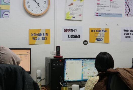 디지털성범죄아웃(DSO) 활동가들이 사무실에서 불법촬영 범죄를 모니터링하고 있다.